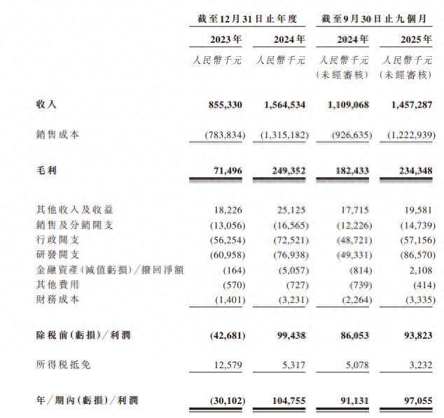 业绩方面,2023年至2024年及2025年前三季度(下称“报告期”),公司收入分别为8.55亿元、15.65亿元及14.57亿元;利润分别为-3010.2万元、1.05亿元及9705.5万元。
